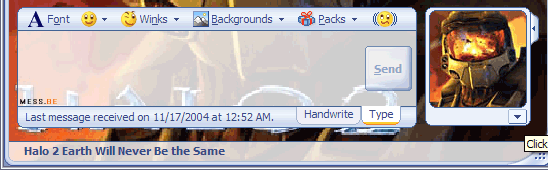 Messer xsicxtransitx noticed a free Halo 2 Pack listed in MSN Messenger 7 for a while already. But not until the new beta build, 0425, he was able to install it. After doing so the completely themed conversation window showed a link at the bottom (Halo 2 Earth Will Never Be The Same) to the official Halo 2 website.