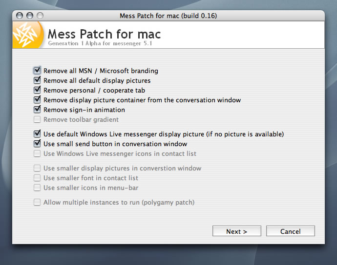 The greyed-out options like polygamy will be added later. Please also note that the Mac version of our Mess Patch was optimized for Microsoft Messenger 5.1.1, and that it is still in experimental phase so should Microsoft Messenger crash then just reinstall the client from scratch.