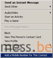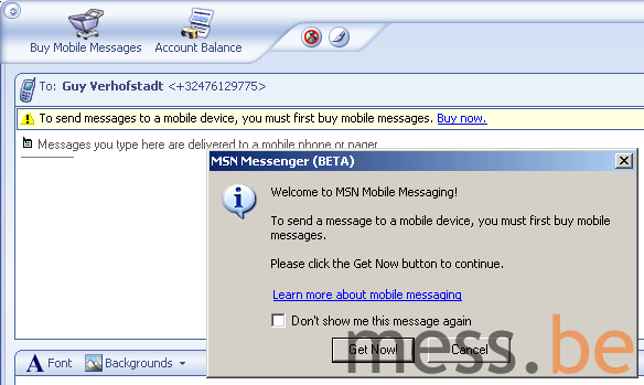 MSN Mobile Messaging is not a free service. Customers need to purchase credits prior to sending SMS messages from MSN Messenger (view screenshot). Via a secured website, you can buy packages of SMS messages for €3.99 per 25 messages (view screenshot). Credits stored in the Microsoft billing system under your Passport account. Also be aware that the person replying from their mobile phone to your SMS will be charged by their mobile service provider.