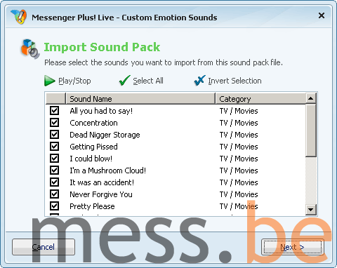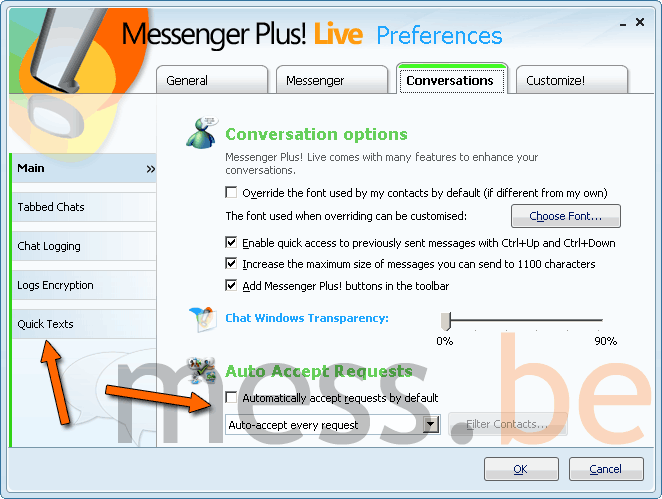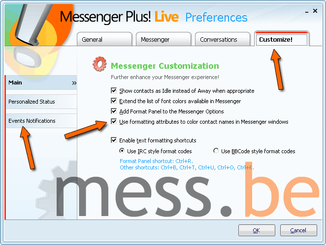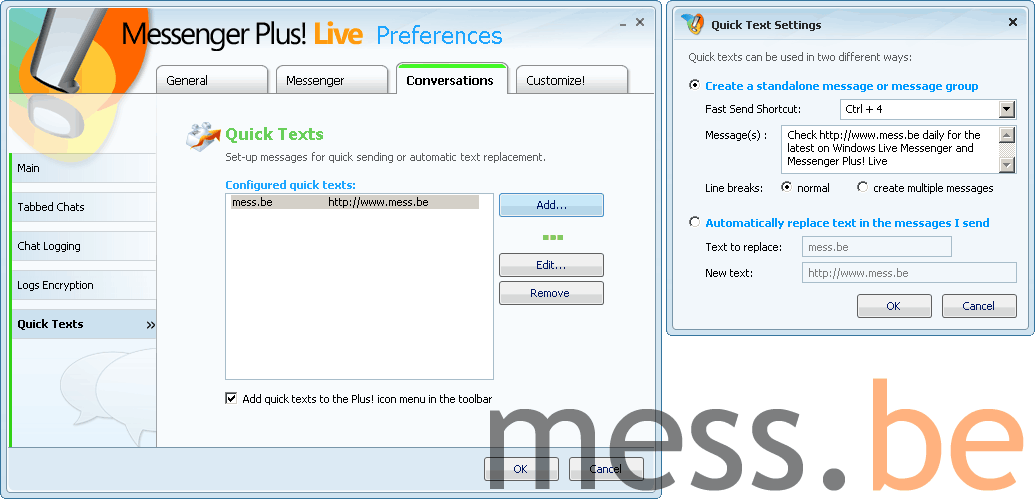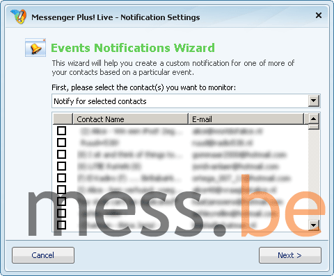 Screenshots: >> The Messenger Plus! Live setup (slideshow). >> The still rather empty About box. >> Custom Emotion Sounds #1, #2, #3. >> New buttons in the Contact List Clean-up. >> The return of Auto-Accepting requests. >> Advanced Features becomes Messenger Customization. >> Meet the Script Editor. >> Quick Texts and word replacing. >> The Events Notification Wizard (slideshow).